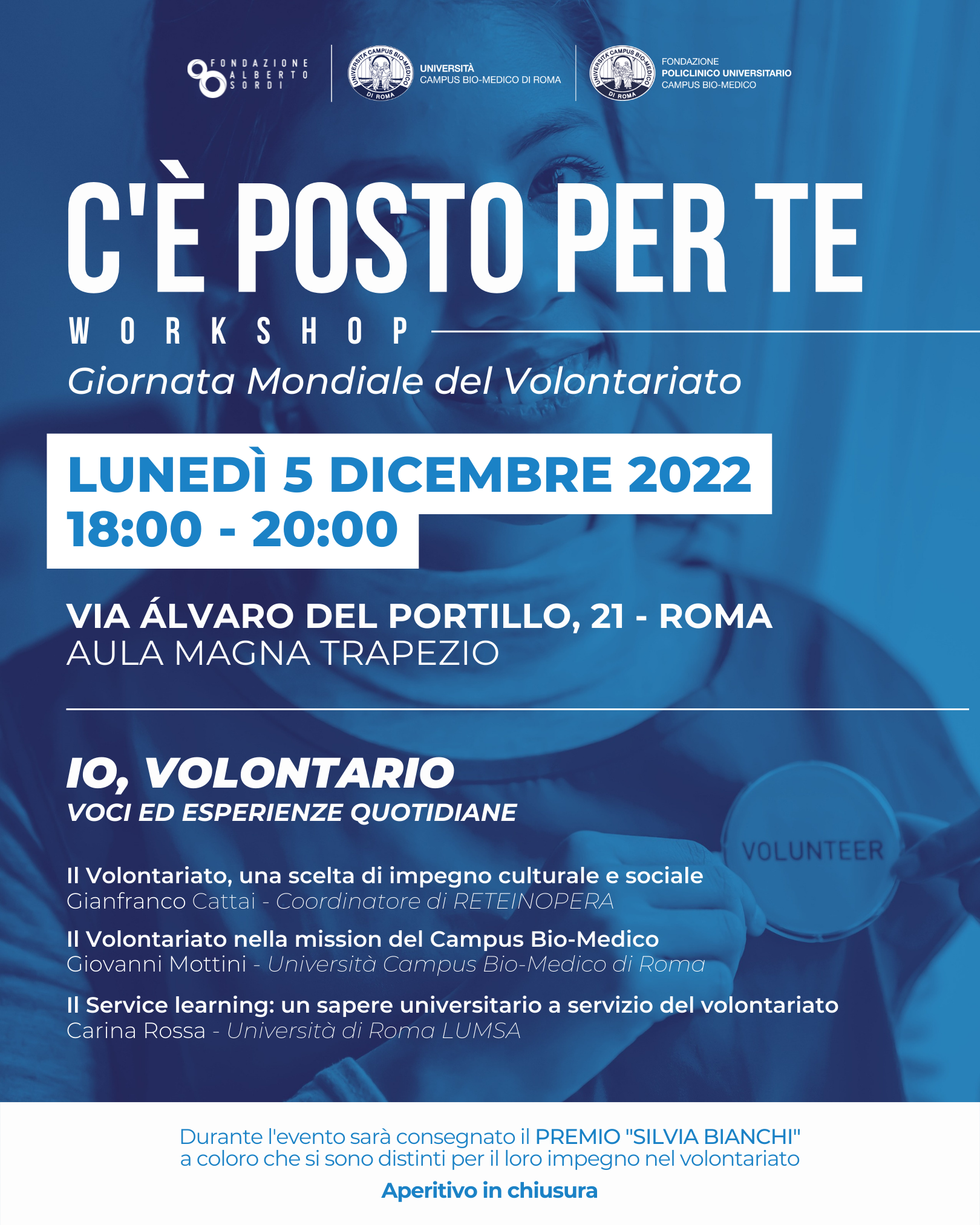 Il Workshop vuole essere un momento di condivisione tra i volontari della Fondazione Alberto Sordi, della Fondazione Policlinico Universitario Campus Bio-Medico e dell’Università Campus Bio-Medico di Roma e di conoscenza per coloro che desiderano donare un po’ del loro tempo ed energie.