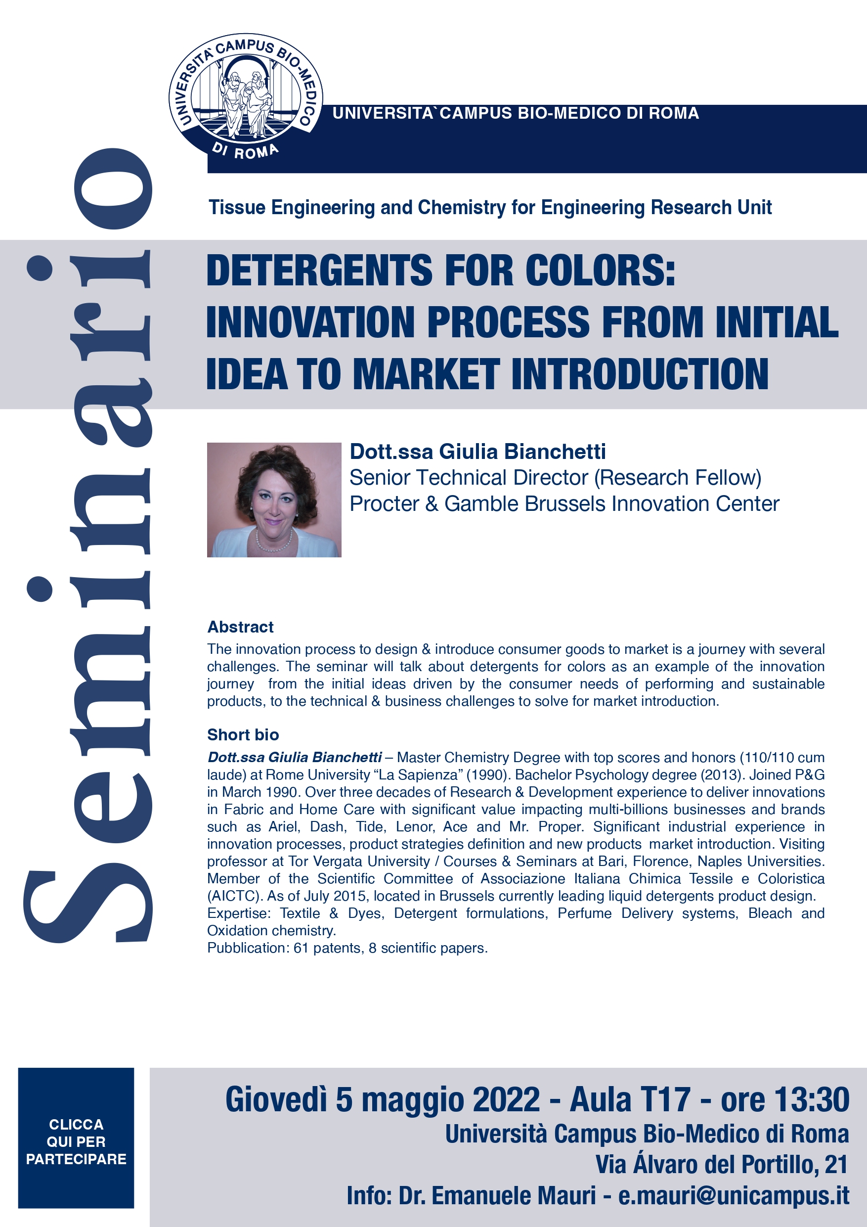 Il seminario parlerà dei detergenti per colori come esempio del percorso di innovazione, dalle idee iniziali guidate dalle esigenze dei consumatori di prodotti performanti e sostenibili, alle sfide tecniche e commerciali da risolvere per l'introduzione sul mercato.