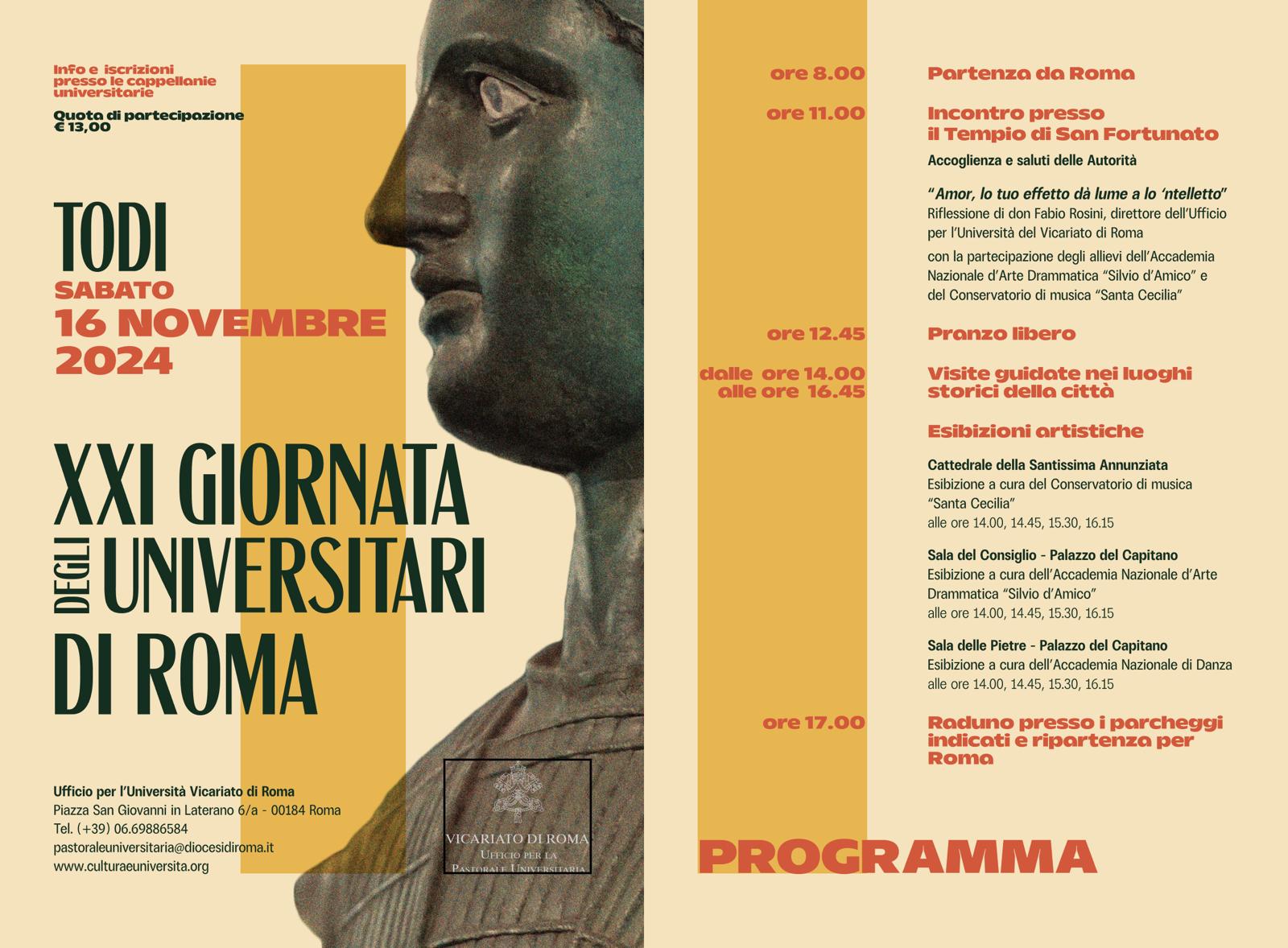 Il prossimo 16 novembre si terrà presso la città di Todi la XXI Giornata degli universitari di RomaPellegrinaggio Diocesano degli universitari, organizzata dal Vicariato di Roma, Ufficio per l'Università.