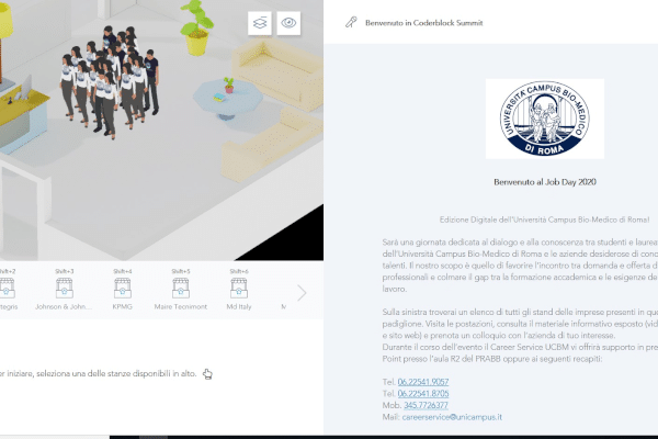 9 ottobre 2020 - Un avatar in movimento tra i padiglioni di grandi aziende in collegamento e la possibilità di prenotare video colloqui per gli studenti dell'Università Campus Bio-Medico di Roma: è la sintesi del Job day UCBM 2020 di giovedì 8 ottobre. Una giornata per la prima volta interamente online grazie all'utilizzo di una piattaforma che ha riprodotto in un ambiente virtuale l'evento che fino allo scorso anno si svolgeva negli spazi universitari.