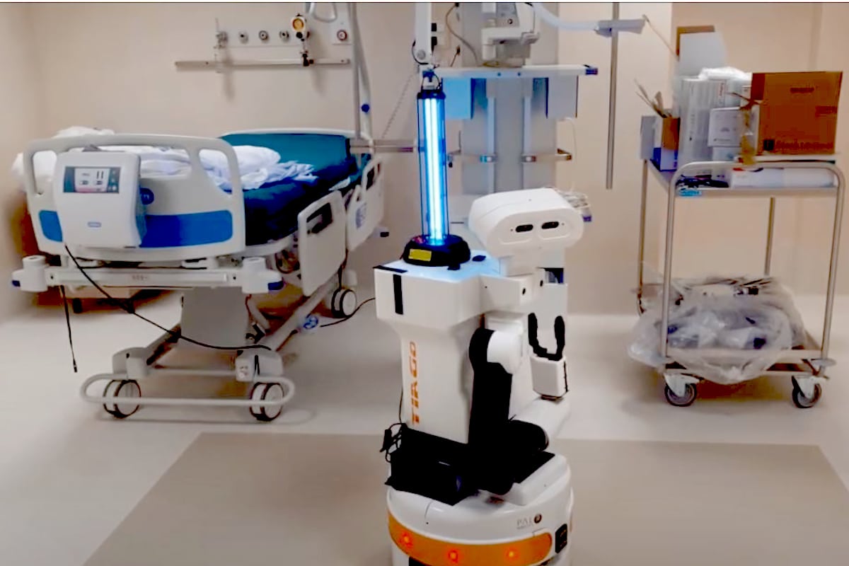 Oltre al trasferimento di farmaci e presidi, il robot è infatti in grado di sanificare gli ambienti di lavoro mediante il trasporto e l’attivazione di lampade a raggi UV germicidi.
