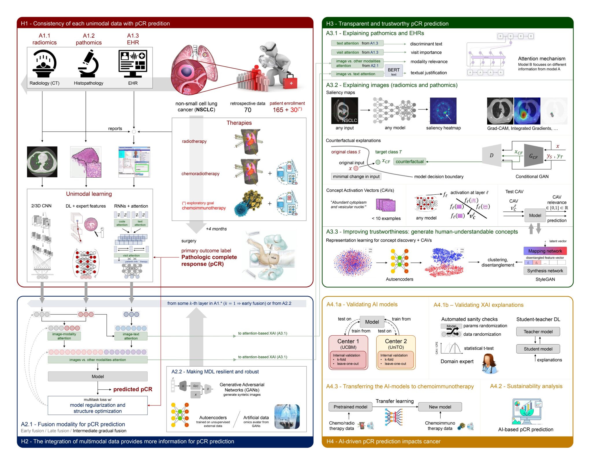 PICTURE pursues the following three objectives: (I) Assess the role of baseline radiology imaging, histology imaging, citology and molecular data and EHRs and their combination to predict pCR; (II) Move forward multimodal deep learning (MDL) to better process multimodal data, making the performance of AI resilient and robust to search the quantitative signature for pCR prediction; (III) Provide explanations of the decisions taken by the AI to improve trust and transparency using explainability AI (XAI) models. PICTURE has an exploratory goal as well: after developing AI models using data from patients undergoing chemoradiation or chemotherapy, it will explore how to transfer the models to predict pCR for those patients undergoing chemoimmunotherapy (Figure 2).
